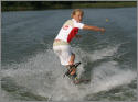 Samstag früh ging Giannina, bestimmt mit gemischten Gefühlen, an den Slalomstart und fuhr souverein mit der 18 m-Leine von 46 über 49, 52 und 55 km/h bis zur 16 m Verkürzung bei der sie noch zwei weitere Bojen schaffte. Damit war das „zweite Training" absolviert und eine Vorlaufplatzierung mit dem ersten Platz erreicht. Jedoch musste sich Giannina die Platzierung mit Maria Haschok ihrer größten Konkurrentin aus Schwielochsee, die das gleiche Ergebnis erreichte, teilen. Im Finale musste Maria Haschok vorlegen. Vier Bojen. an der 18 m Leine mit 55 km/h waren nun zu schlagen. Normalerweise mit der Sicherheit aus einer vernünftigen Trainingsvorbereitung kein Problem, aber diese Sicherheit gab es nicht. Die Spannung stieg. Noch nie war Giannina und das Team um sie einer solchen Spannung ausgesetzt, Start mit 49 km/h, sodass bei 55 die Kraft ausreichte um ihre Mitbewerberin in die Schranken zu weisen, Leichte bis schwere Unsicherheiten bei 49 und 52 km/h ließen die Spannung steigen. Jedoch Giannina erkämpfte Boje um Boje. Dann jedoch ein blitzsauberer 55-ger mit sechs Bojen und die Titelverteidigung war sicher gestellt. Jedoch wer Giannina kennt, wusste was sie jetzt wollte. Die persönliche Bestleistung sollte fallen. Mit 5 Bojen an der 16 m Leine war allerdings Schluss - Immerhin die Bestleistung eingestellt.